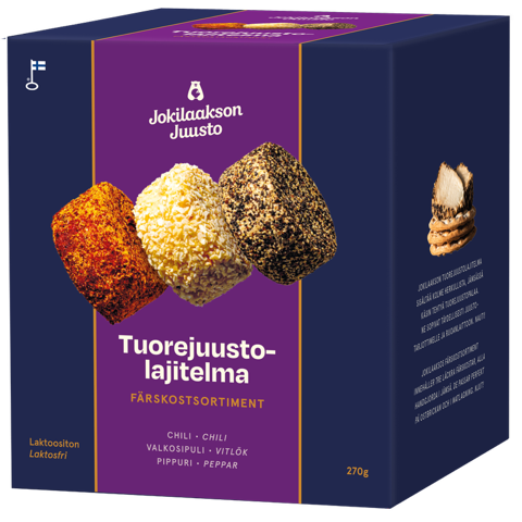 Jokilaakson Juuston valikoimassa on perinteisiä juustoja, kuutioita ja raasteita, sulatejuustoja, tuorejuustoja sekä juustodippejä.